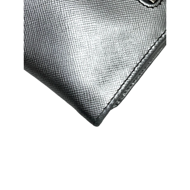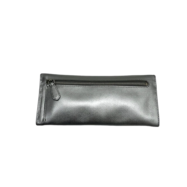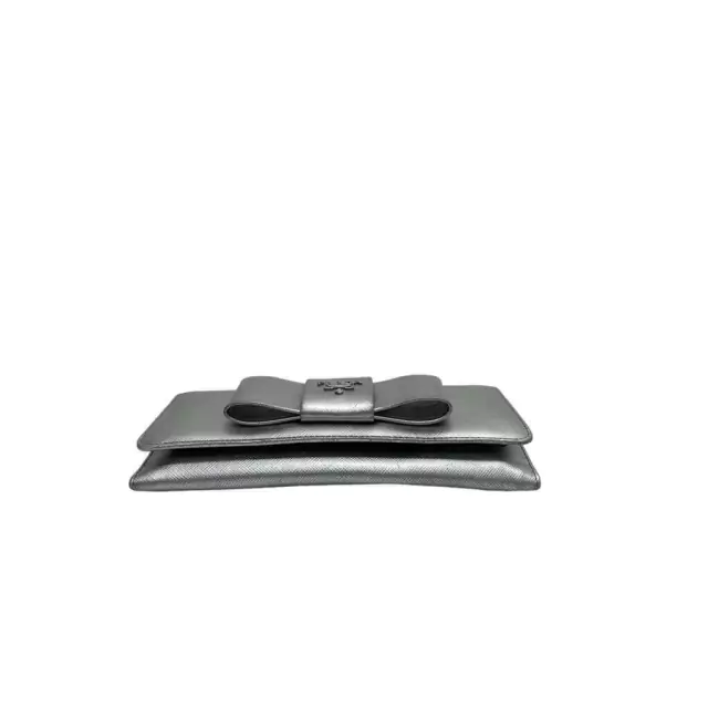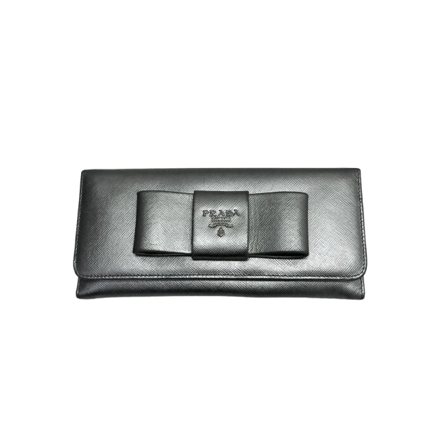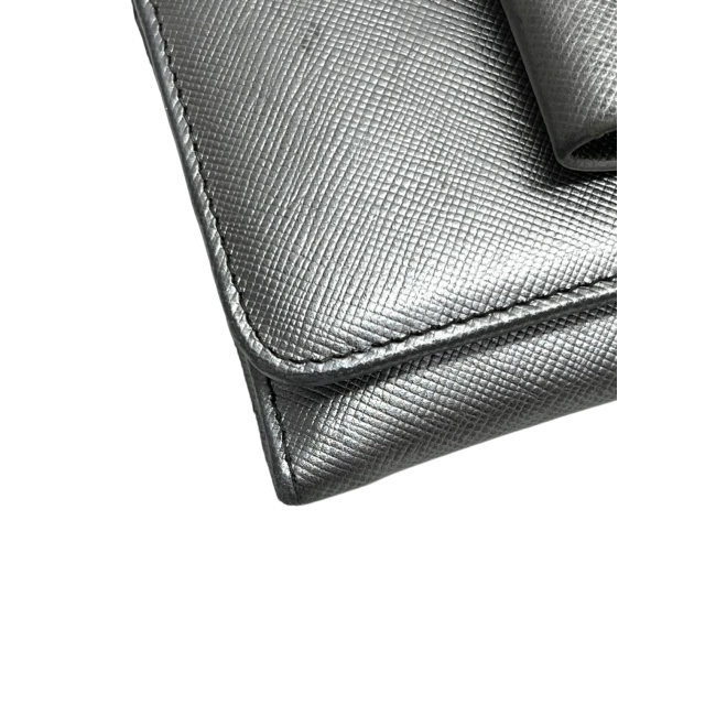 Prada Saffiano Bow Continental Wallet Metalizada confeccionada em couro na cor prata metalizada, fechamento em flap por botões de pressão, ferragens na cor prata, compartimento interno duplo com um bolso por fecho em zíper, três bolsos abertos e espaços para cartões.